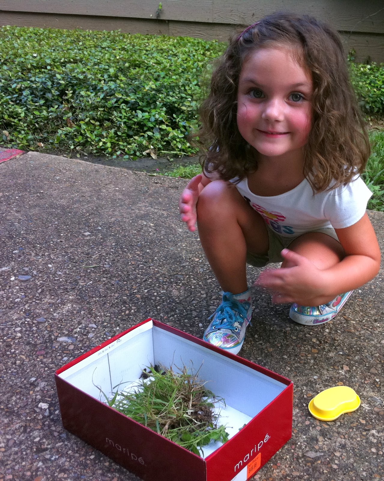 We made a makeshift habitat for them with grass, dirt and a water dish, and Ella loved watching them and checking them out in the box.